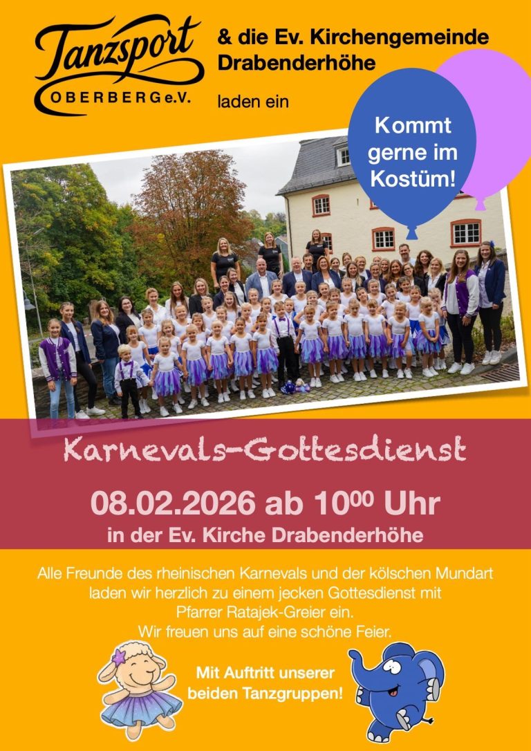 Der Karnevals-Gottesdienst findet am 08. Februar 2026 ab 10 Uhr in der Ev. Kirche Drabenderhöhe statt. Kommt gerne im Kostüm vorbei und verpasst nicht den Auftritt unserer beiden Tanzgruppen.